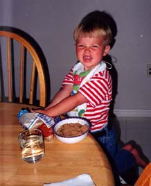 Nathan (as I poured him some Captain Crunch cereal Lane bought): "SUGAR!!!!" (In this photo, Nathan has put his own brown sugar on some hot cereal, which amounted to be about half of the bag of brown sugar. Notice that you can hardly see the cereal for the sugar!)
